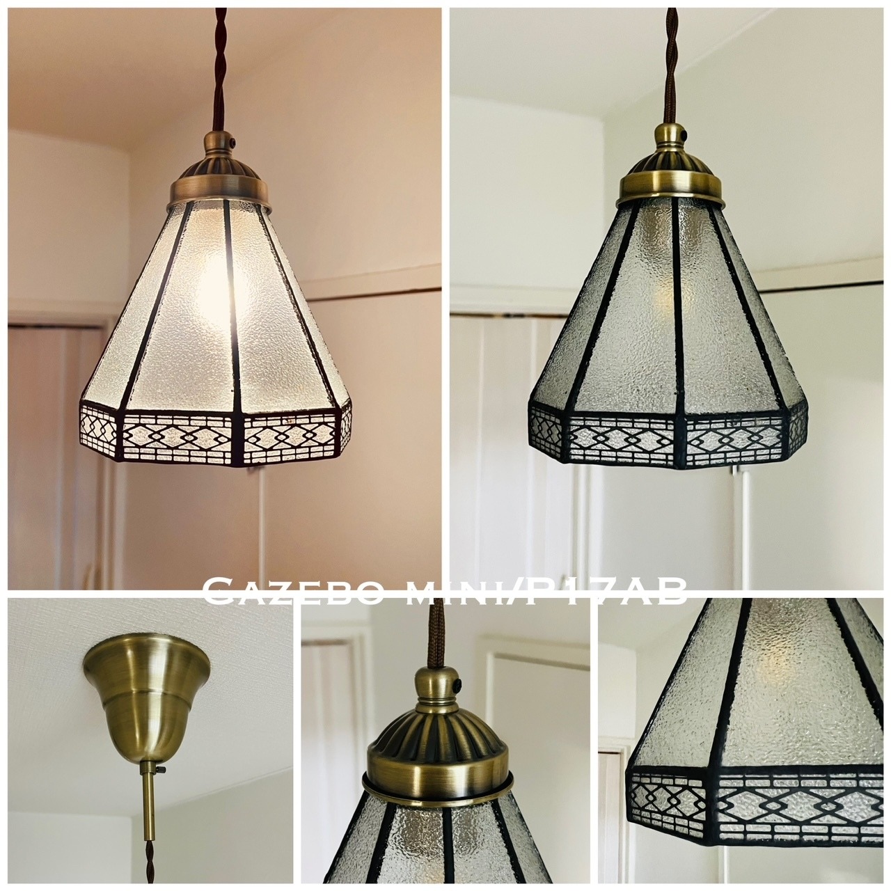 天井照明 Gazebo-m/PAB ガゼボ ミニ ペンダントライト ステンドグラス ランプシェード エイジング加工 ブレード飾り付 E17磁器ソケット コード長調節収納式 アンティークブラスメッキ 真鋳古色仕上 リング固定式 シェードホルダー シーリングカバー付 LED電球 白熱灯電球 使用可能 白熱灯電球は60Wまで 電球別売